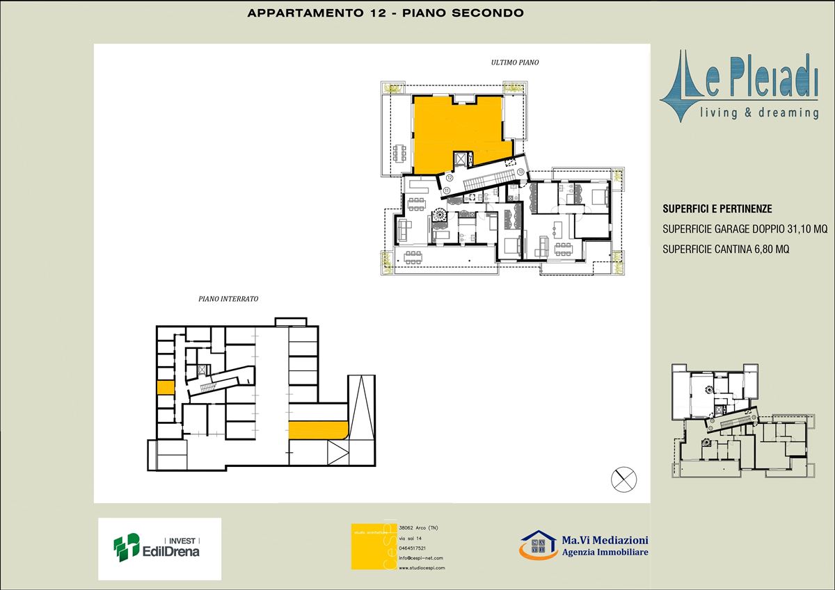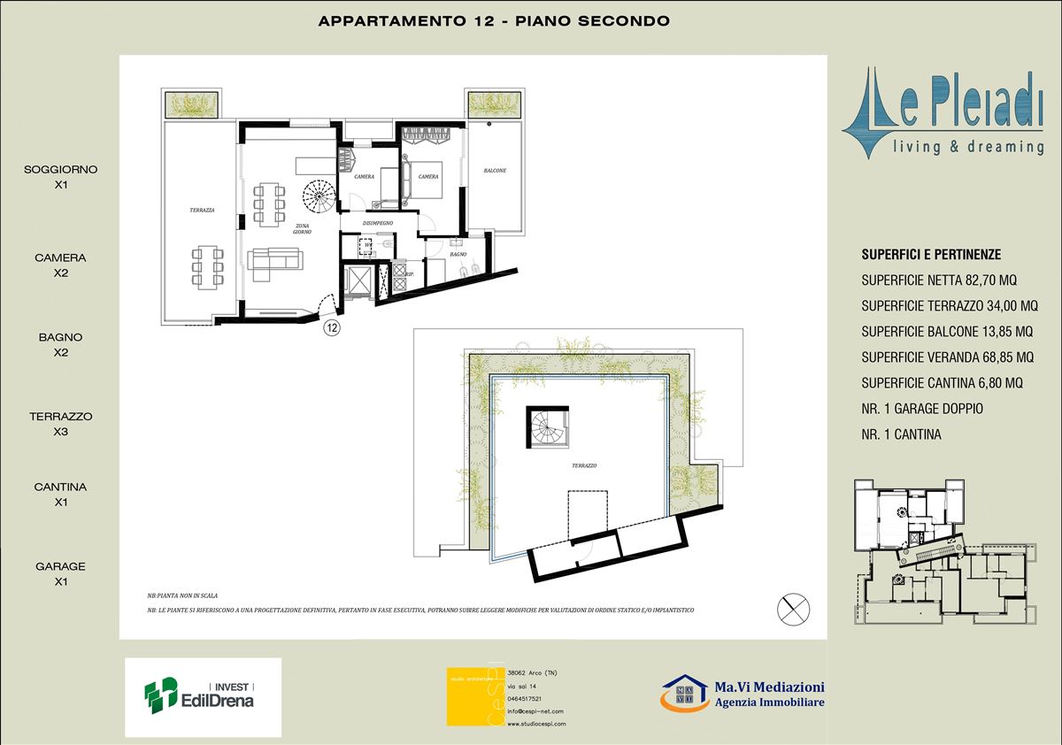 All'interno del nuovo complesso "Le Pleiadi", l'Appartamento 12 è un attico situato al piano secondo. Questa unità si distingue per un layout funzionale e per una dotazione di spazi esterni eccezionale, ideale per chi cerca una residenza moderna con ampi sfoghi all'aperto. L'abitazione si sviluppa su una superficie netta di 82,70 mq ed è organizzata in modo razionale: - zona living: un ambiente open-space luminoso che integra soggiorno e cucina, con accesso diretto al terrazzo principale; - zona notte: composta da due camere da letto e due bagni, garantendo un’ottima gestione della privacy domestica; - pertinenze: La proprietà include una cantina e un garage doppio. L’elemento caratterizzante di questo attico è l’ampia metratura destinata all'esterno, distribuita su più livelli: - terrazzo e balcone: al piano dell'appartamento troviamo un terrazzo di 34 mq e un balcone di 13,85 mq; - veranda superiore: al livello superiore si sviluppa una veranda di 68,85 mq, uno spazio versatile e panoramico unico nel contesto di Riva del Garda.